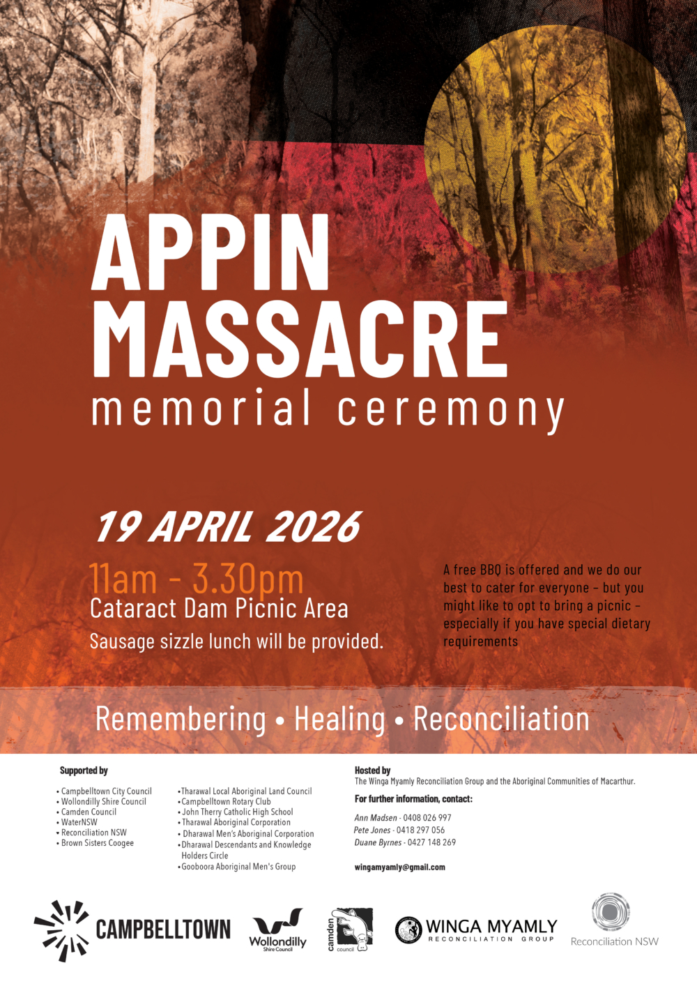 The annual memorial ceremony will be held on Sunday 19 April 2026, from 11am to 3.30pm at the Cataract Dam Picnic Area . All are invited to attend in a spirit of remembrance, respect, and solidarity with the Dharawal people who lost their lives, and with the descendants of those who survived.