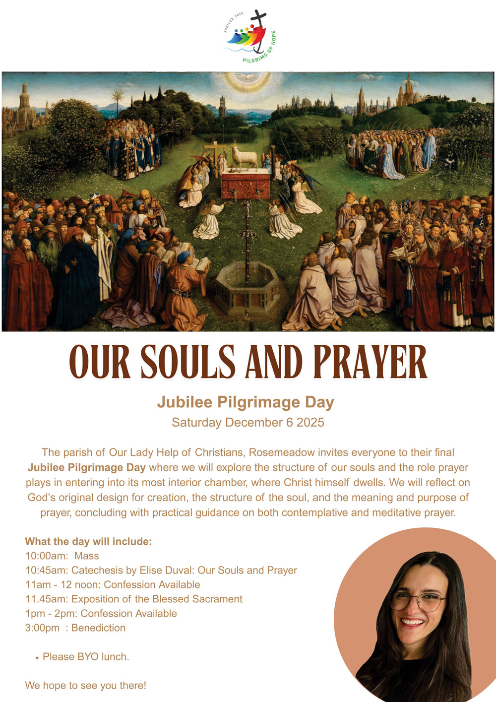 The parish of Our Lady Help of Christians, Rosemeadow invites everyone to our final Jubilee Pilgrimage Day. The day will include a catechesis that will explore God’s plan for creation, the structure of the soul, and the essential role of prayer in leading us into the innermost chamber of our souls, where Christ our Bridegroom dwells.
