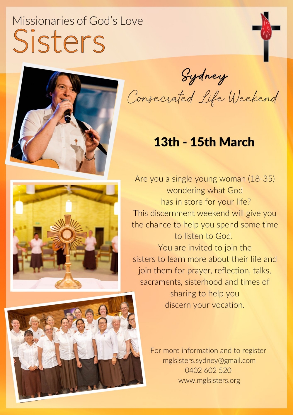 The MGL Sisters Sydney invite single women aged 18–35 to a weekend of prayer, reflection and discernment.
