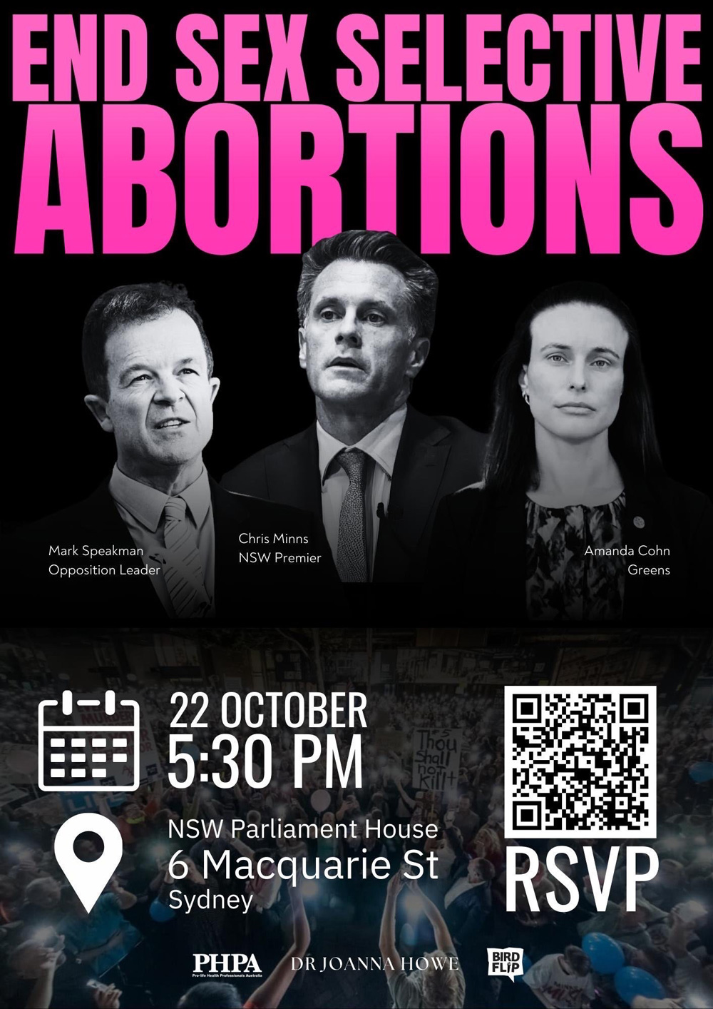 URGENT rally this month against sex-selective abortions on Wednesday 22nd of October at 5:30pmoutside NSW Parliament House. We MUST put the pressure on our politicians and REFUSE to allow them get away with killing unborn babies simply because of their gender. Let’s shut down Macquarie St and stay silent no longer. RSVP using the link below.